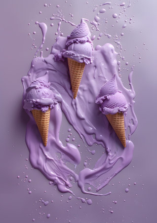 Three Melting Purple Ice Cream Cones On Lavender Background
