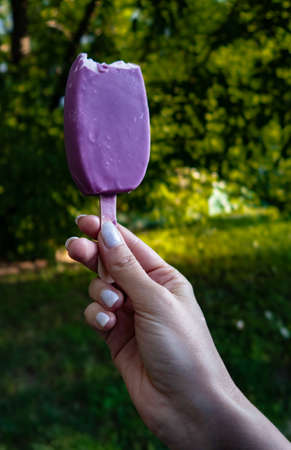purple ice cream in a female hand on a summer background. High quality photo