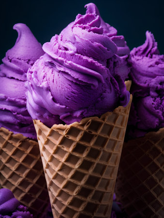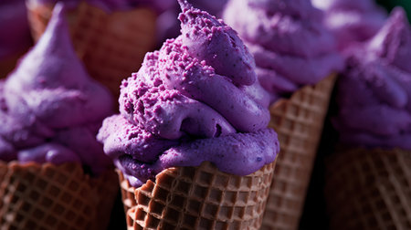 Close up of purple ice cream in waffle cones on dark background