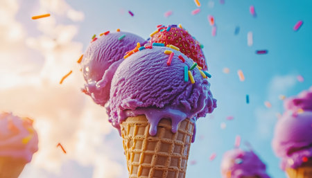 Indulgent Triple Scoop Ice Cream Cone, Melting Under a Summer Sky, with Festive Rainbow Sprinkles