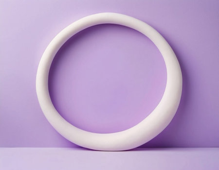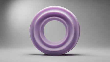 A smooth, pastel purple torus shape with distinct concentric rings is presented against a soft gradient gray background, illuminated by studio lighting.