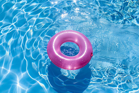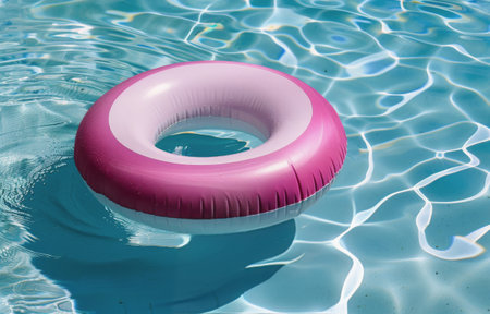 Pink pool float ring floating in a refreshing blue swimming pool. Top view