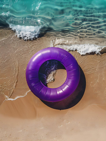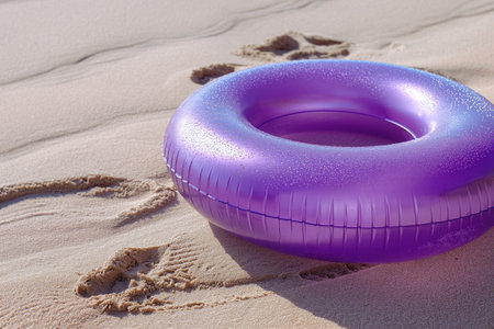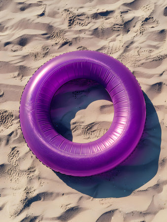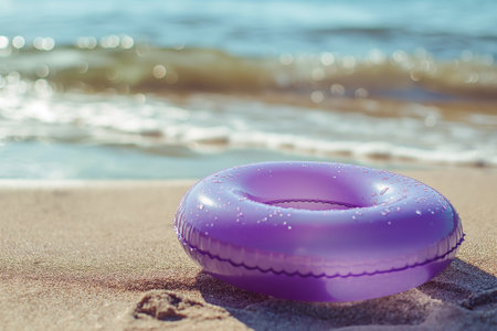 Inflatable ring on the sand near the sea. Summer vacation concept