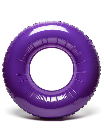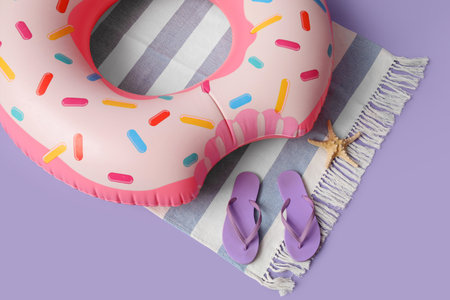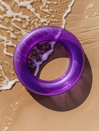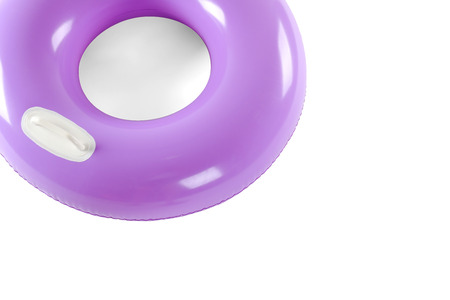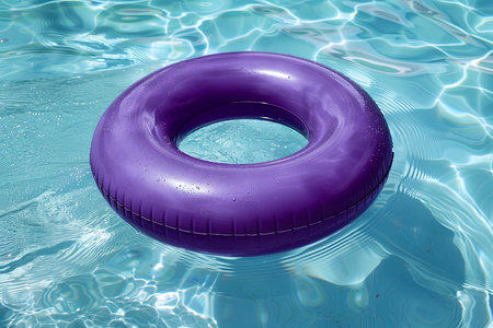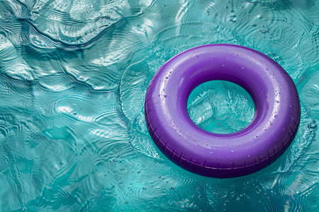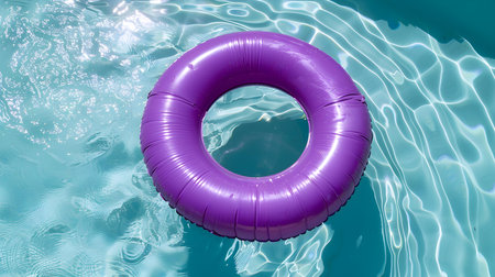 Top view of a purple inflatable ring floating on pool water. Colorful Summer Background