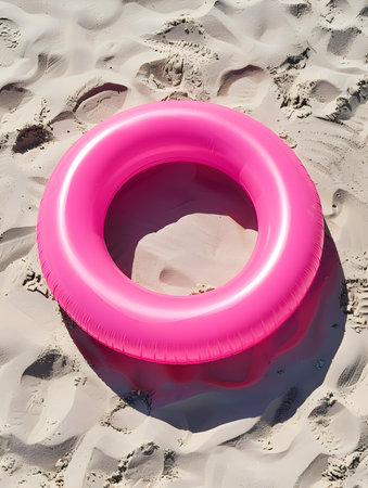 Pink swimming ring or pool toy on sandy summer beach. Minimal holiday concept with sharp sunny shadow with sand texture. Above view. Flat lay.