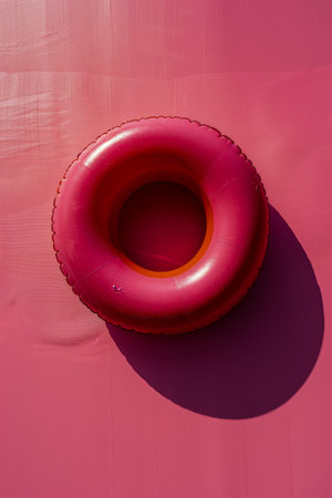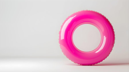 A bright pink inflatable ring is placed on a smooth pink surface. The simplicity of the composition highlights the playful and vibrant nature of summer fun by the pool.