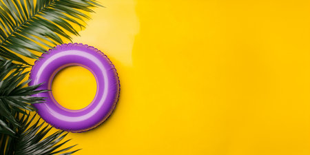 A fun and colorful inflatable swimming ring on a bright yellow background, surrounded by tropical palm leaves. Concept of summer vacation, relaxation, beach time, and pool fun