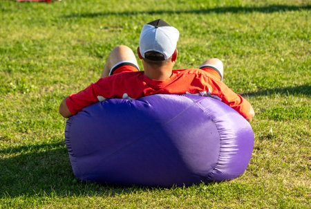 A man is laying on a purple bean bag chair in a grassy field. The man is wearing a red shirt and a black hat. Scene is relaxed and leisurely