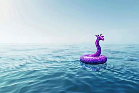 A purple inflatable giraffe leisurely floating on the calm ocean waters under the clear blue sky.