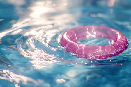 A pink inflatable float rests gently on calm water, reflecting the sun's rays. The serene atmosphere invites relaxation, perfect for a warm summer day by the pool.