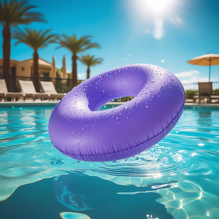 A purple inflatable ring drifts gently in a clear blue swimming pool under a bright sun, with palm trees and lounge chairs visible in the background.