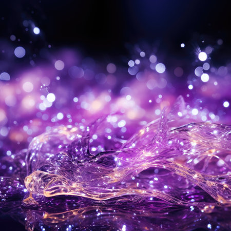 An abstract composition a dense cluster of glowing fiber optic strands emitting vibrant purple and blue light. Numerous out-of-focus bokeh circles in shades of pink and purple add a dreamy, ethereal to the scene. The conveys a sense of energy, technology, and dynamic movement against a dark, sparkling background.