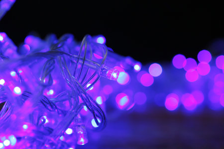 Defocused bokeh lights on black background, an abstract naturally blurred backdrop for Valentines Day or birthday party. Festive light texture. Violet blue garland in blur. Color 2022