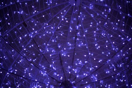 Night, street decoration, festive background. The branches of the tree are decorated with a garland. Violet lights, flicker, glare. It's all blurry.