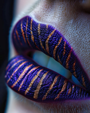 A Close-Up Portrait of Lips Adorned With Metallic Gold and Purple Stripes.