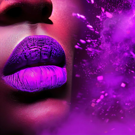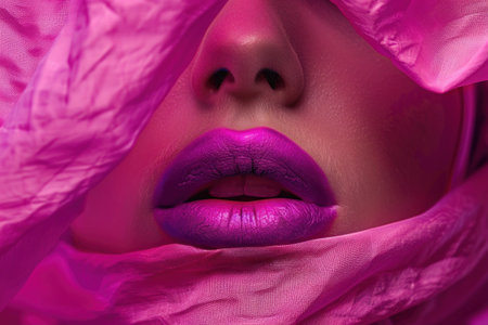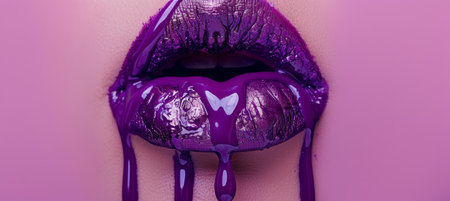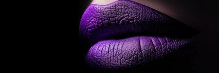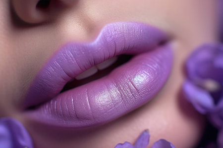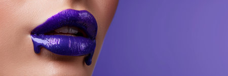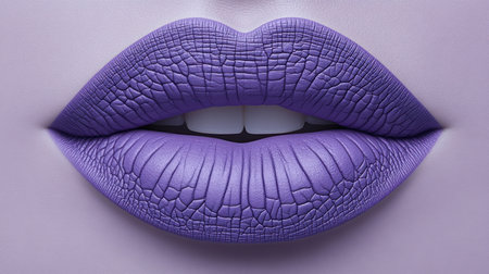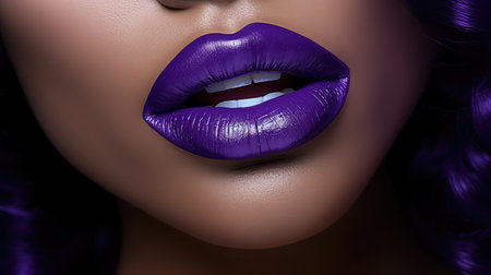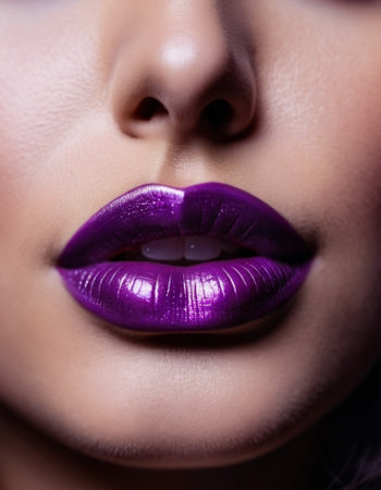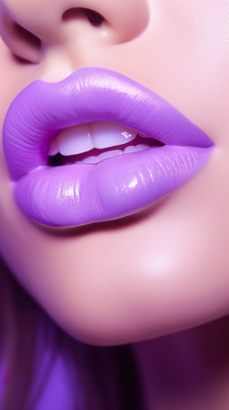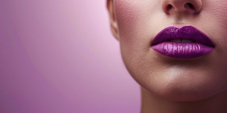 An artistic close-up image featuring vibrant purple lips on a smooth skin background, showcasing beauty and elegance in makeup and fashion artistry.
