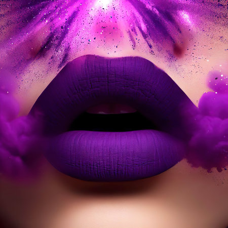 Purple lipstick and powerful explosion of purple dust in the background