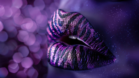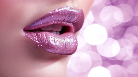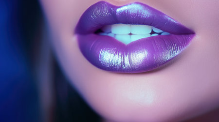 A close-up of a woman lips, featuring shimmering purple lipstick that adds a touch of sparkle. Lips are slightly parted, revealing a glimpse of white teeth. Sensuality and sexuality. AI generated.