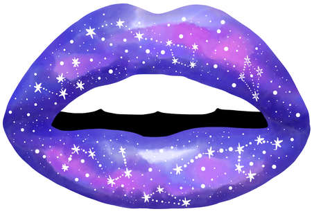 Galaxy starry gloss open lips with constellations. Fashion feminine concept design. Digital watercolor