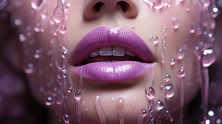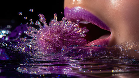This striking close-up captures glossy purple lips creating mesmerizing water splashes, reflecting vibrant colors and droplets, evoking a sense of beauty and creativity.