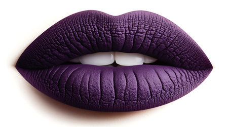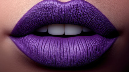 This striking close-up image showcases a model's lips adorned with a vibrant purple matte lipstick, emphasizing the rich color and detailed texture perfect for beauty promotion.