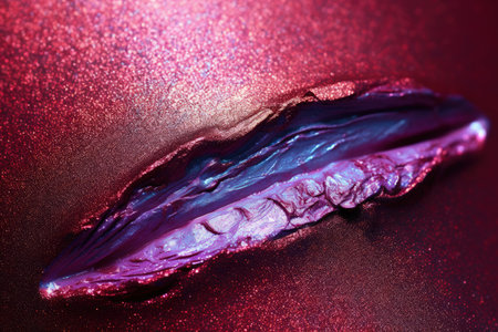 Smudged burgundy lip stick texture with holographic shimmer