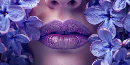 close-up of women's lips, lilac lipstick, lip gloss, delicate lilac flowers around, spa and cosmetology concept, skin care, bright makeup, horizontal banner