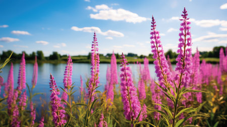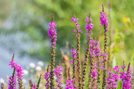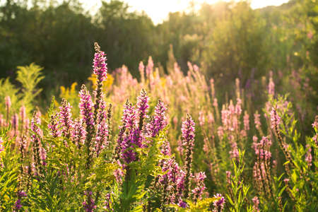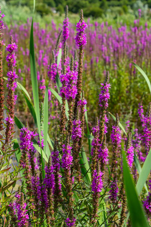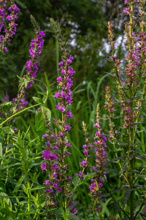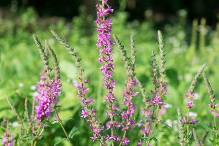 Pink Lythrum Salicaria growing in a meadow close to the river under the warm summer sun