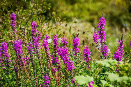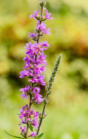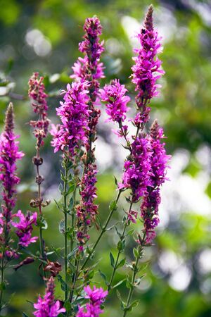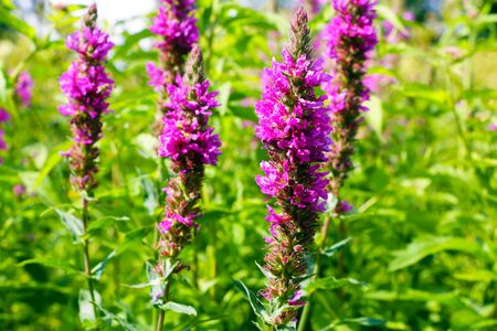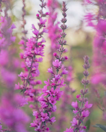 Close up of summer purple wildflowers. Lythrum salicaria or purple loosestrife. Medicinal plant. Nature background