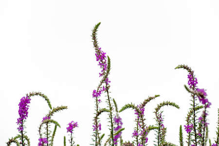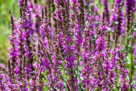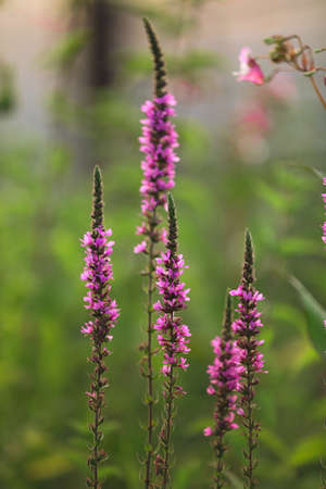 Violet inflorescences loosestrife ,Lythrum salicaria.Blooming purple loosestrife growing at a garden. Floral background. summer wildflowers