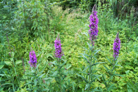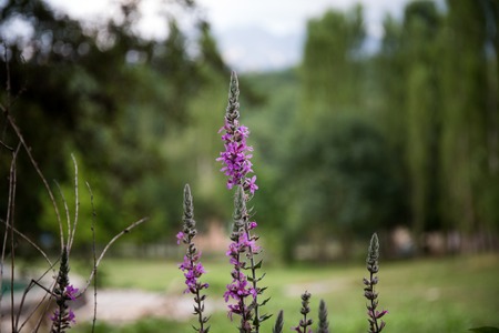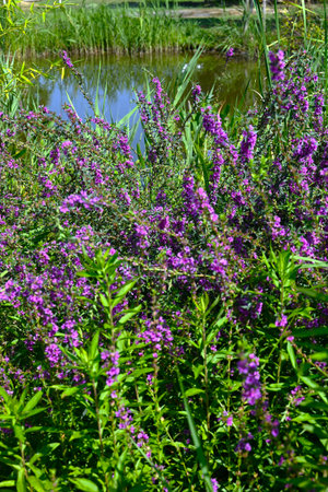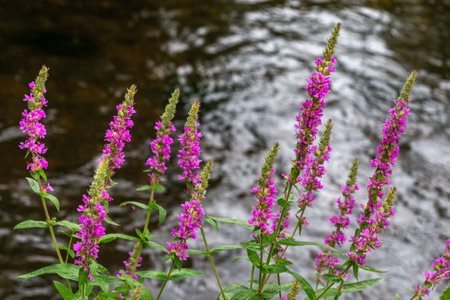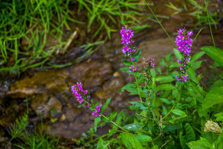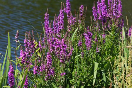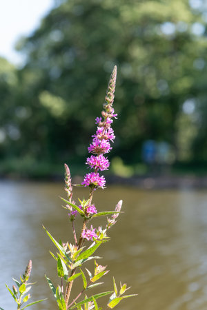 Lythrum salicaria grows in the wild on the riverbank
