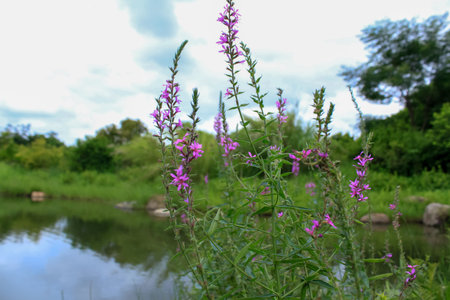 Purple wildflower Lythrum also called Purple Loosestrife growing near a river in rural Minnesota, USA.