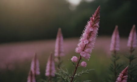 Beautiful pink flowers in the meadow at sunset. Soft focus.