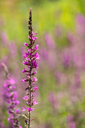 Lythrum salicaria, purple loosestrife flowers in meadow macro selective focus