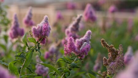 Billards Spirea Blooming flowers in the morning park on the lake close up