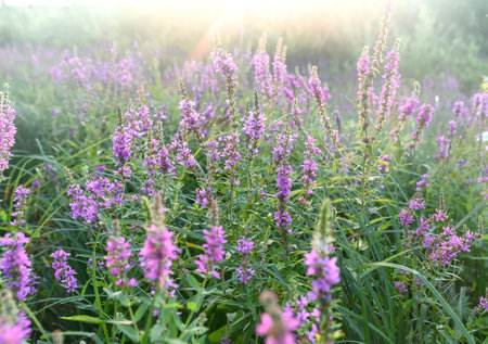 Lythrum virgatum in the rural field with wild grass. Purple wild flowers in the countryside. Flower and plant.