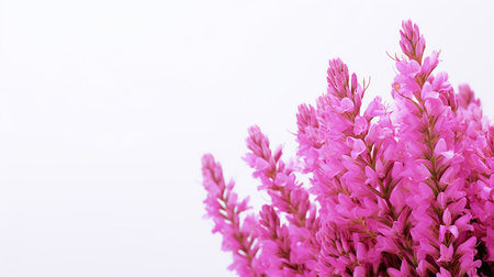 Beautiful bright lilac-pink bunch of common heather Calluna vulgaris on a lite blue background