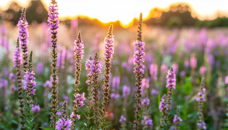 beautiful purple wildflowers at sunset green grass sunlight summer