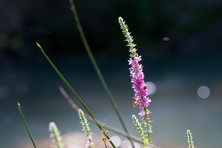 a blossoming purple loosestrife (Lythrum salicaria) on the riverbank