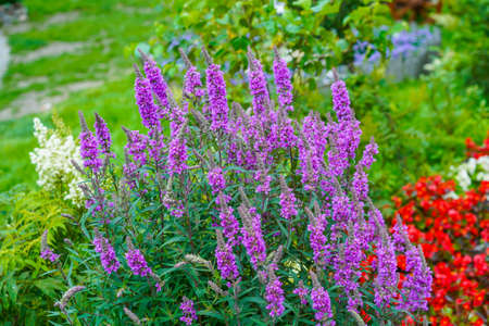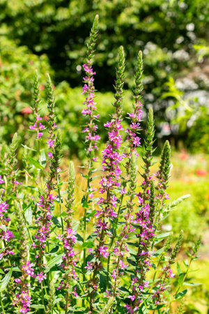Purple loosestrife flowers blossoming in the garden on sunny summer day. Lythrum tomentosum or spiked loosestrife on a flower bed outdoors.