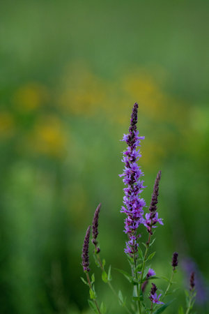 Summer Flowering Purple Loosestrife, Lythrum tomentosum or spiked loosestrife and purple lythrum on yellow green blured background.