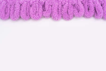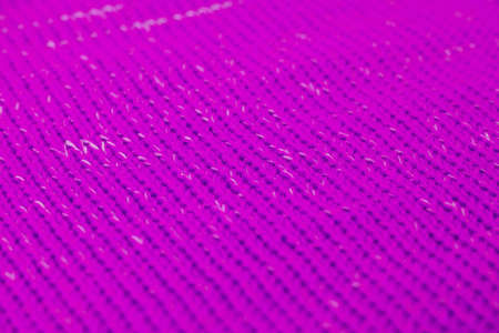 Background texture of roll of pink purple pattern stitch knitted fabric made of wool. Close up.