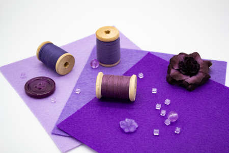 Purple sewing items: felt in three shades of lilac, wooden spools with thread, beads, buttons, and a purple rose.