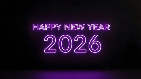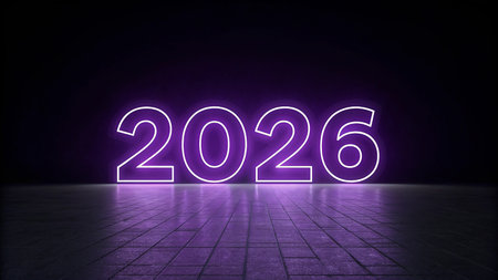 Year 2026 sign. New beginnings. Bright future. Neon glow.
