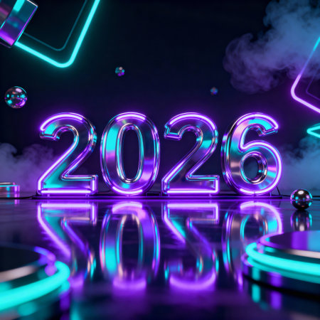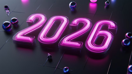Vibrant neon representation of the year 2026, showcasing glossy numbers against a dark background, surrounded by colorful orbs for a modern aesthetic.