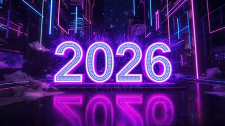 Bright pink neon year 2026 glows against a dark, futuristic city.