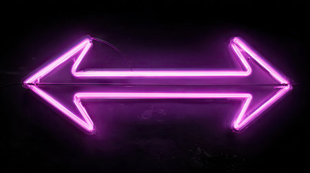 A vibrant neon arrow sign illuminates against a stark black backdrop. The sign features sharp angles and a symmetrical design, rendered in a bright pinkish-purple hue. The image showcases a modern style, with the bright light providing contrast and potentially suitable for promotional or editorial uses.