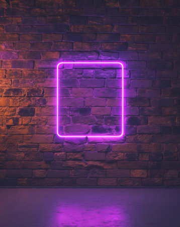 A captivating neon light frame glows in a dark urban environment, surrounded by fog and reflections on wet pavement, evoking a mysterious and modern atmosphere.