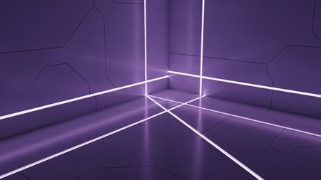 Purple abstract interior background with glowing neon lines. 3d rendering