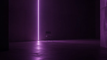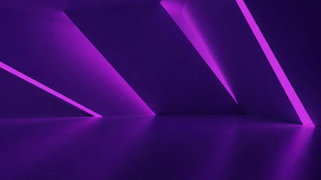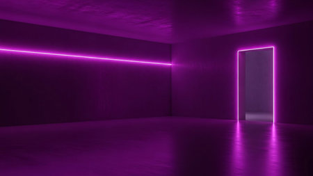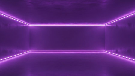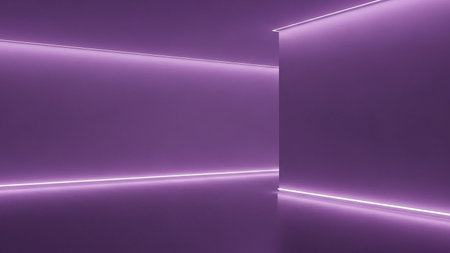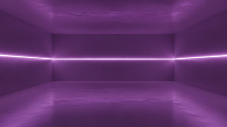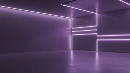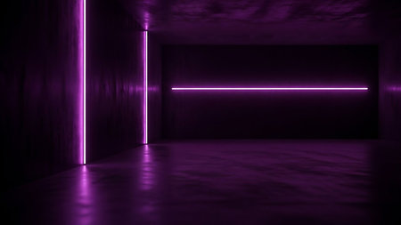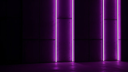 A striking of a modern interior featuring a dark concrete wall. Vertical strips of vibrant purple neon light are embedded within the wall, creating a futuristic and sleek aesthetic. The lights cast a vivid glow, contrasting sharply with the dark, smooth concrete surface. The minimalist emphasizes clean lines and geometric patterns, with the illumination creating an atmospheric and contemporary backdrop.